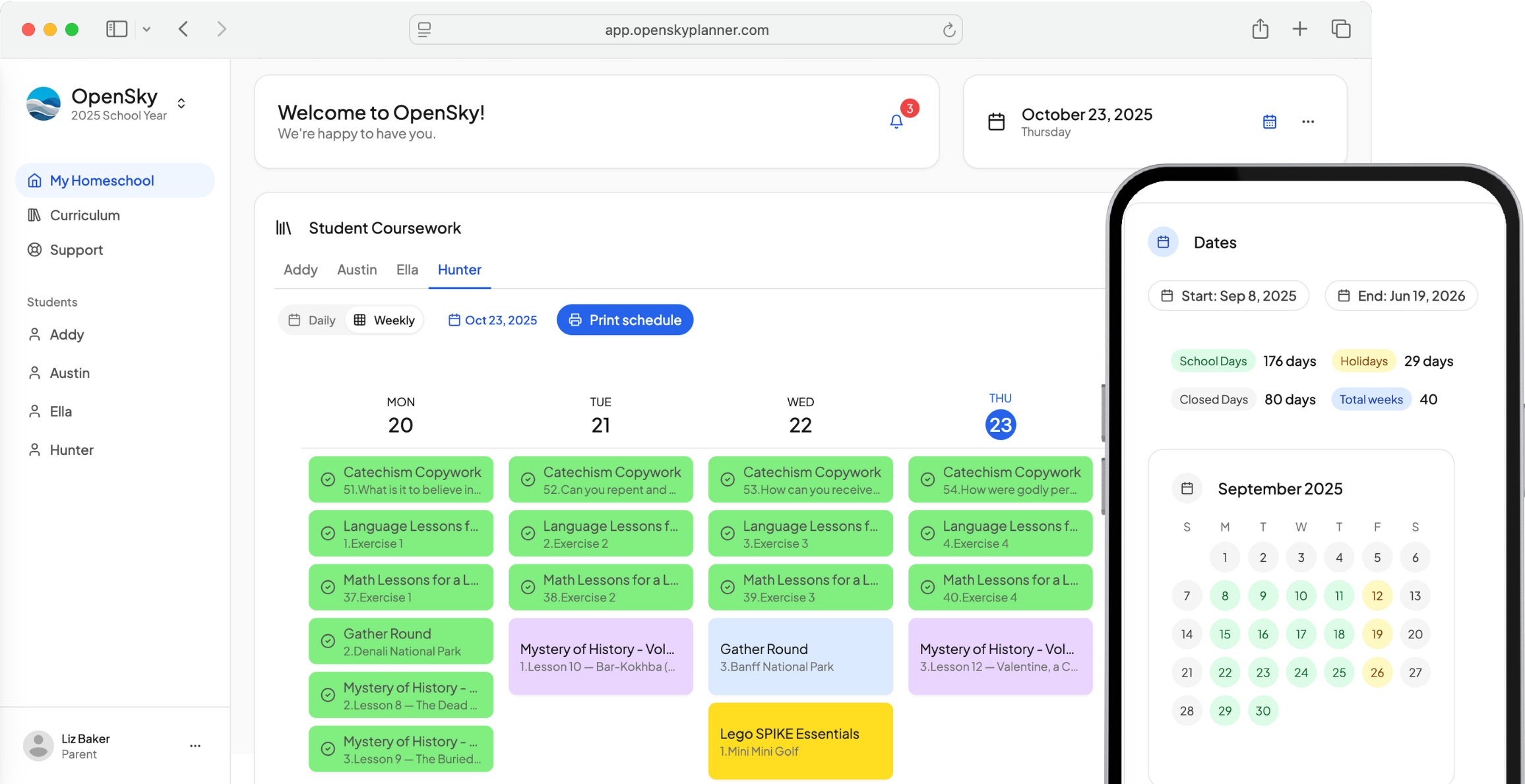 Save hours running your homeschool.OpenSky's automated planning and daily student checklists keep school moving—without getting in the way.