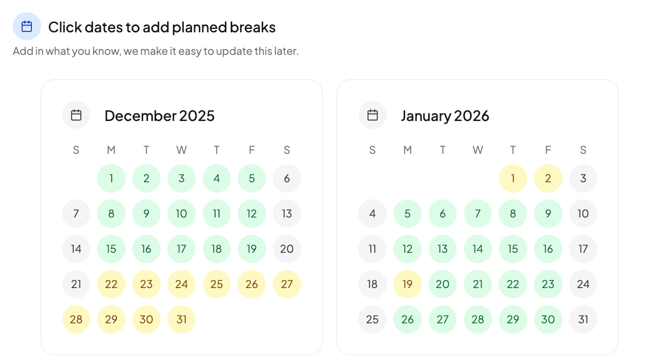 Lessons flow naturallyWithout a rigid end date, lessons schedule forward naturally based on your teaching days. Take breaks when you need them, push forward when you're motivated—the calendar adapts.