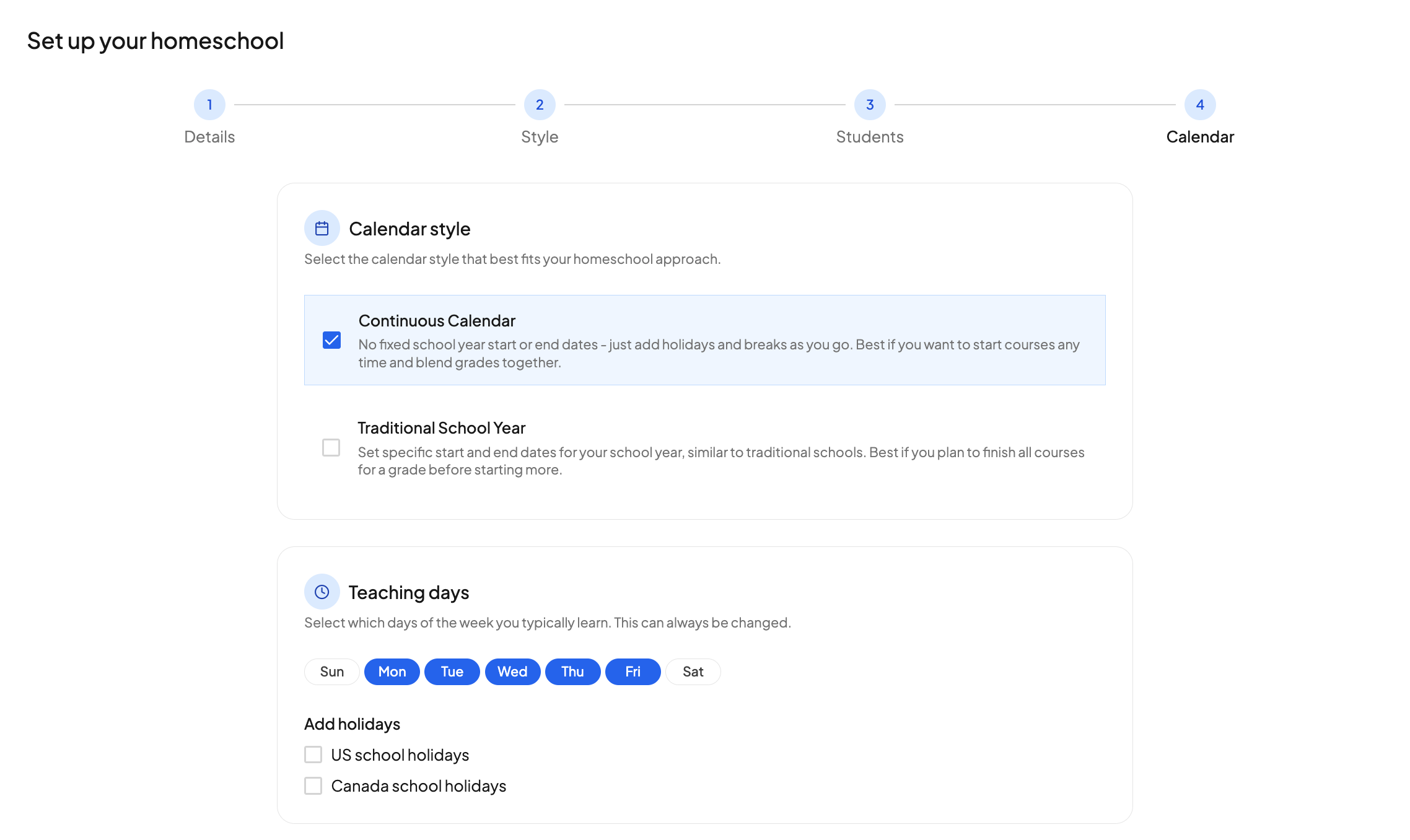 Perfect for flexible learningSome families don't operate on traditional school calendars. Continuous mode gives you complete freedom to structure learning around your life, not an arbitrary calendar.