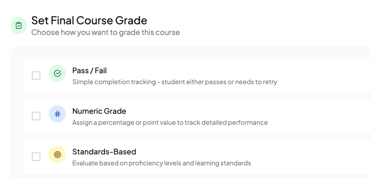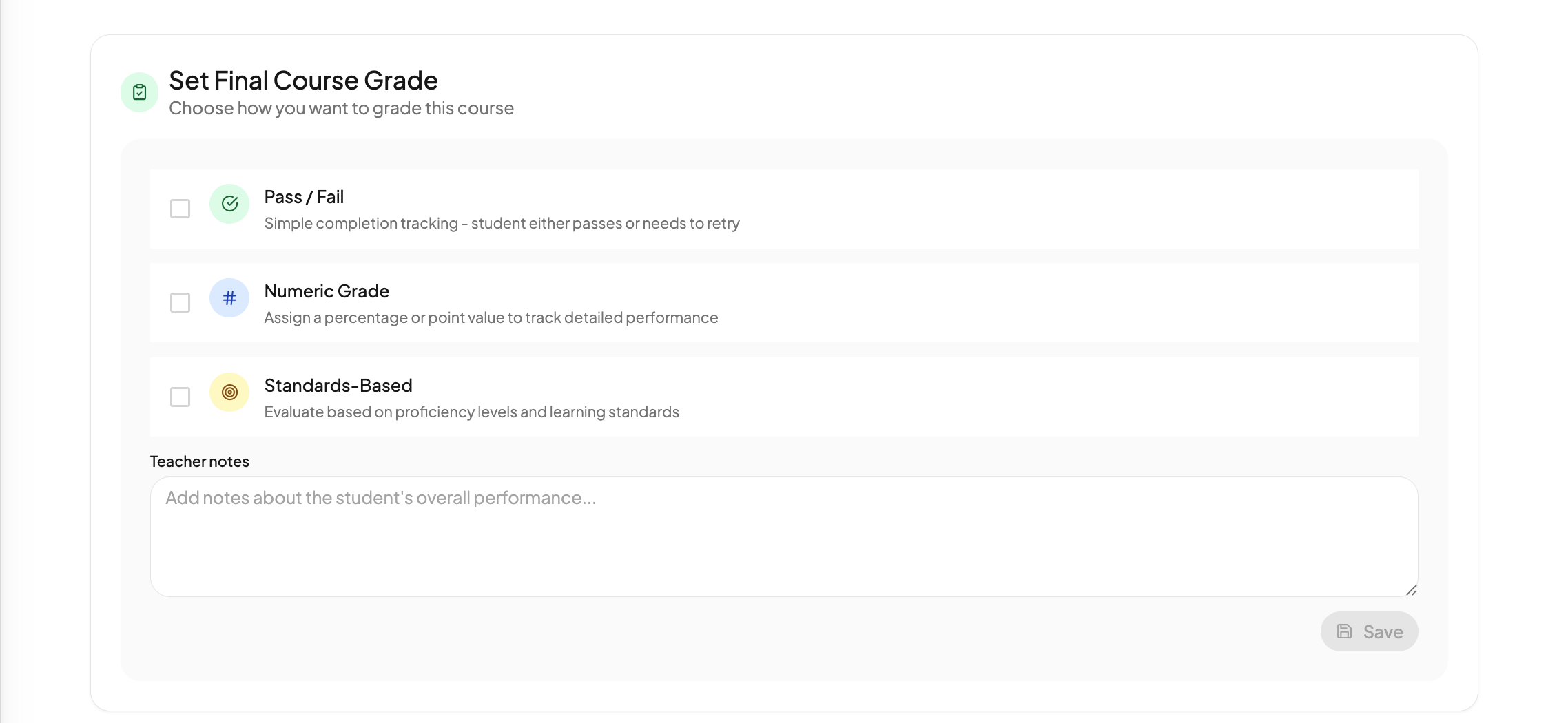 Manage course-level gradesSet final grades for completed courses. These flow directly into transcripts and provide a holistic view of student performance across the year.