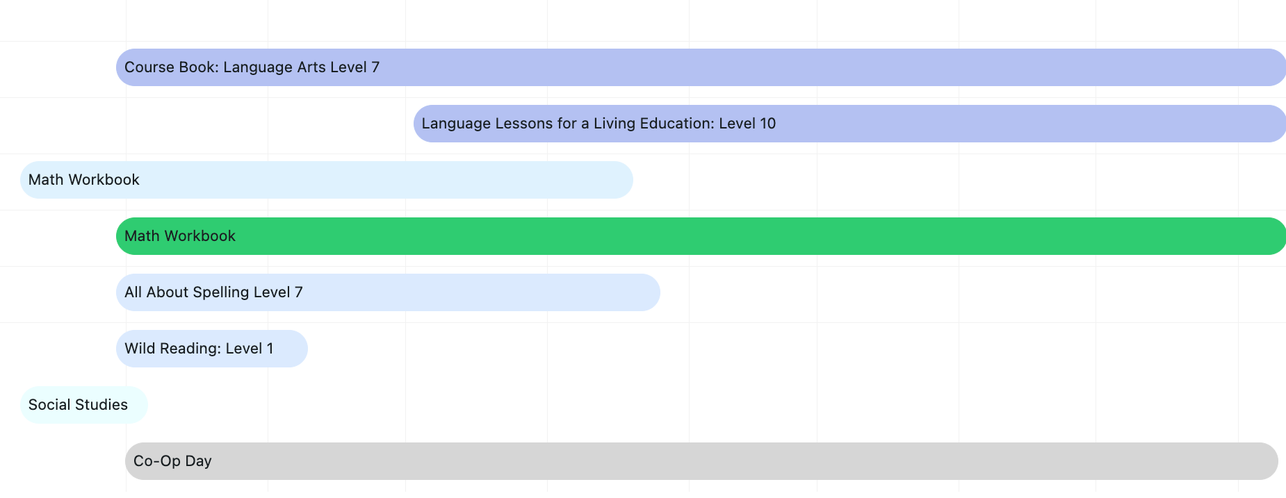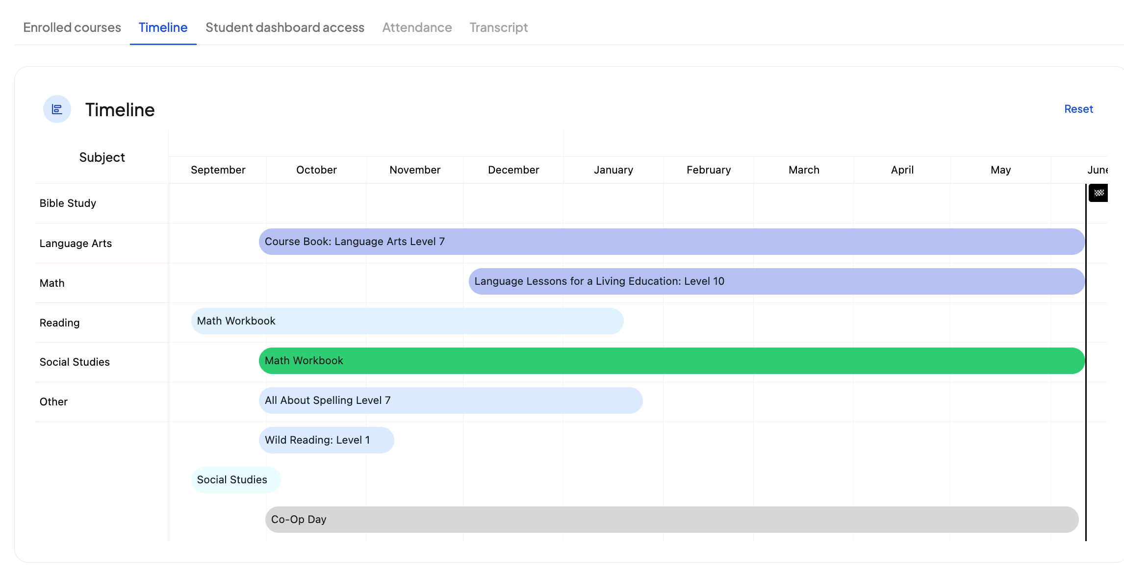 See the full year at onceThe timeline view displays all enrolled courses as horizontal bars spanning the school year. Instantly understand when courses overlap and when students have lighter or heavier loads.