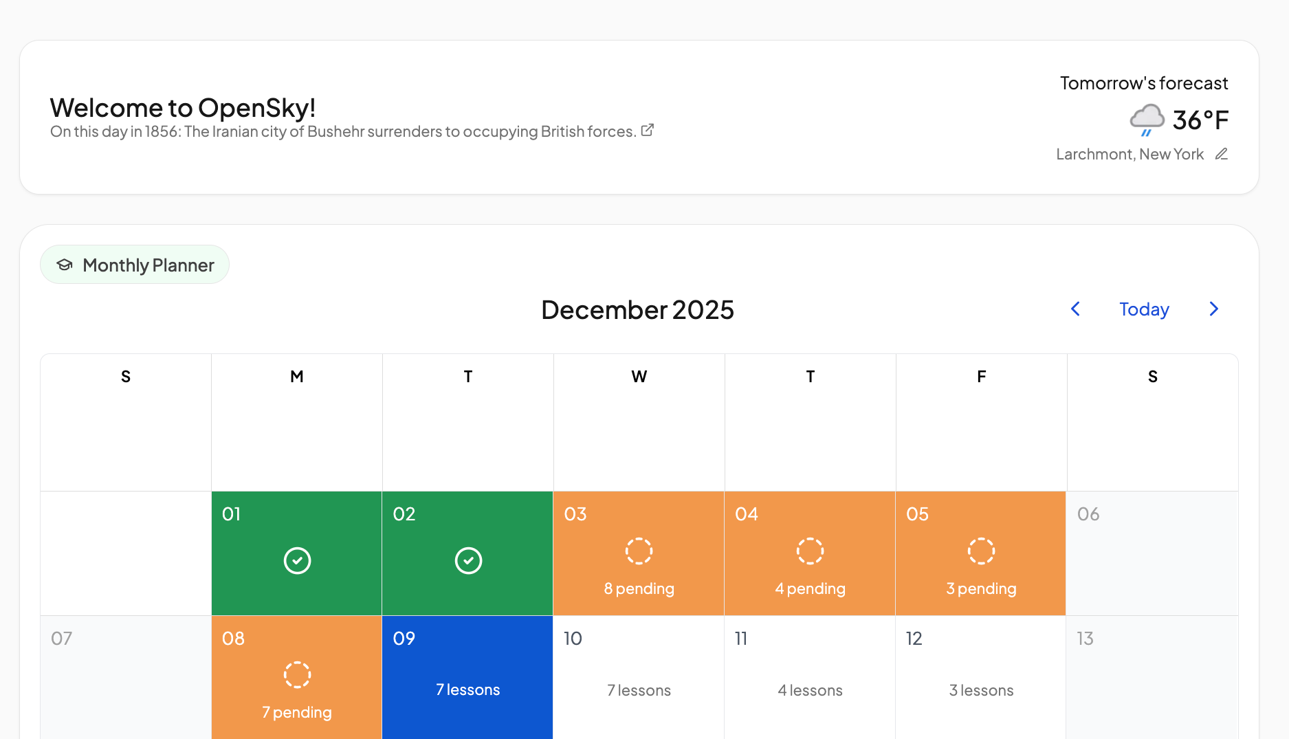 You're Always PlanningHomeschool parents think three steps ahead. Weather on your dashboard means smarter daily planning: schedule outdoor science when it's sunny, save cozy read-alouds for rainy afternoons. You're already planning lessons, meals, and activities—might as well plan around the weather too. One less thing to juggle.