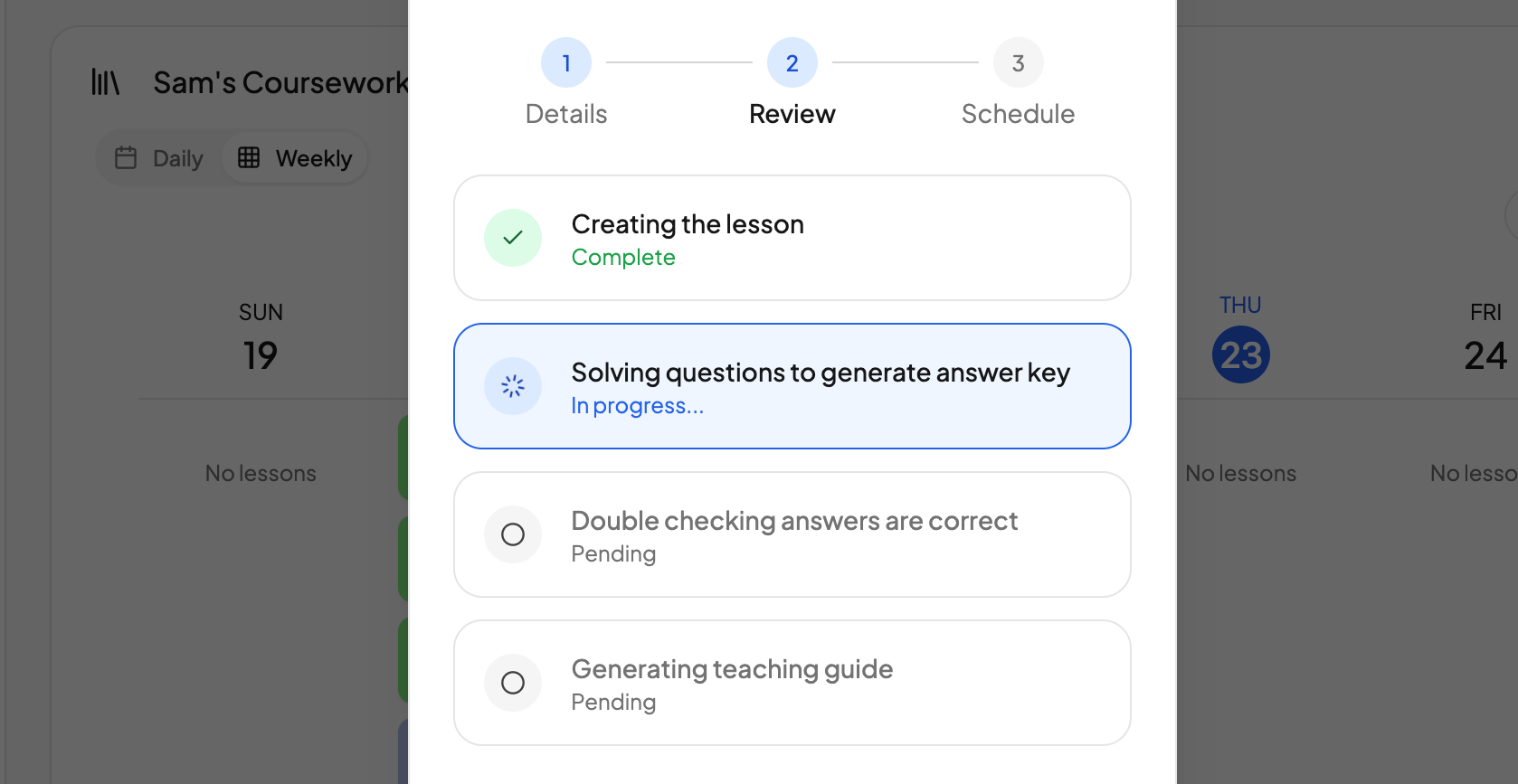 Custom Lessons On-DemandNeed an extra math worksheet? A reading comprehension exercise? A science activity? Describe what you need and AI generates a complete lesson in seconds.