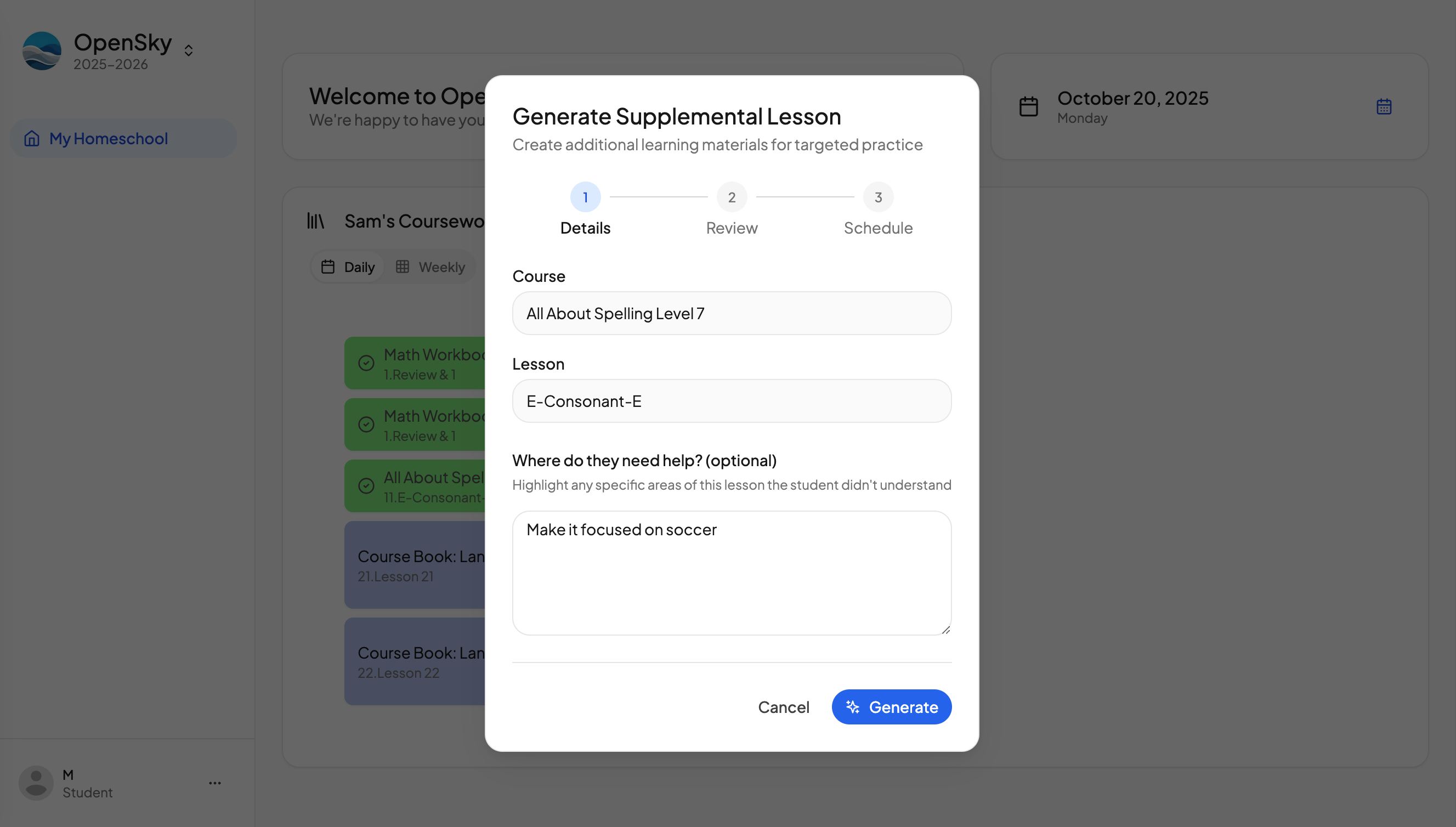 Supplemental Lesson GeneratorNeed extra practice? Generate custom lessons in seconds—tailored to age, subject, and style.