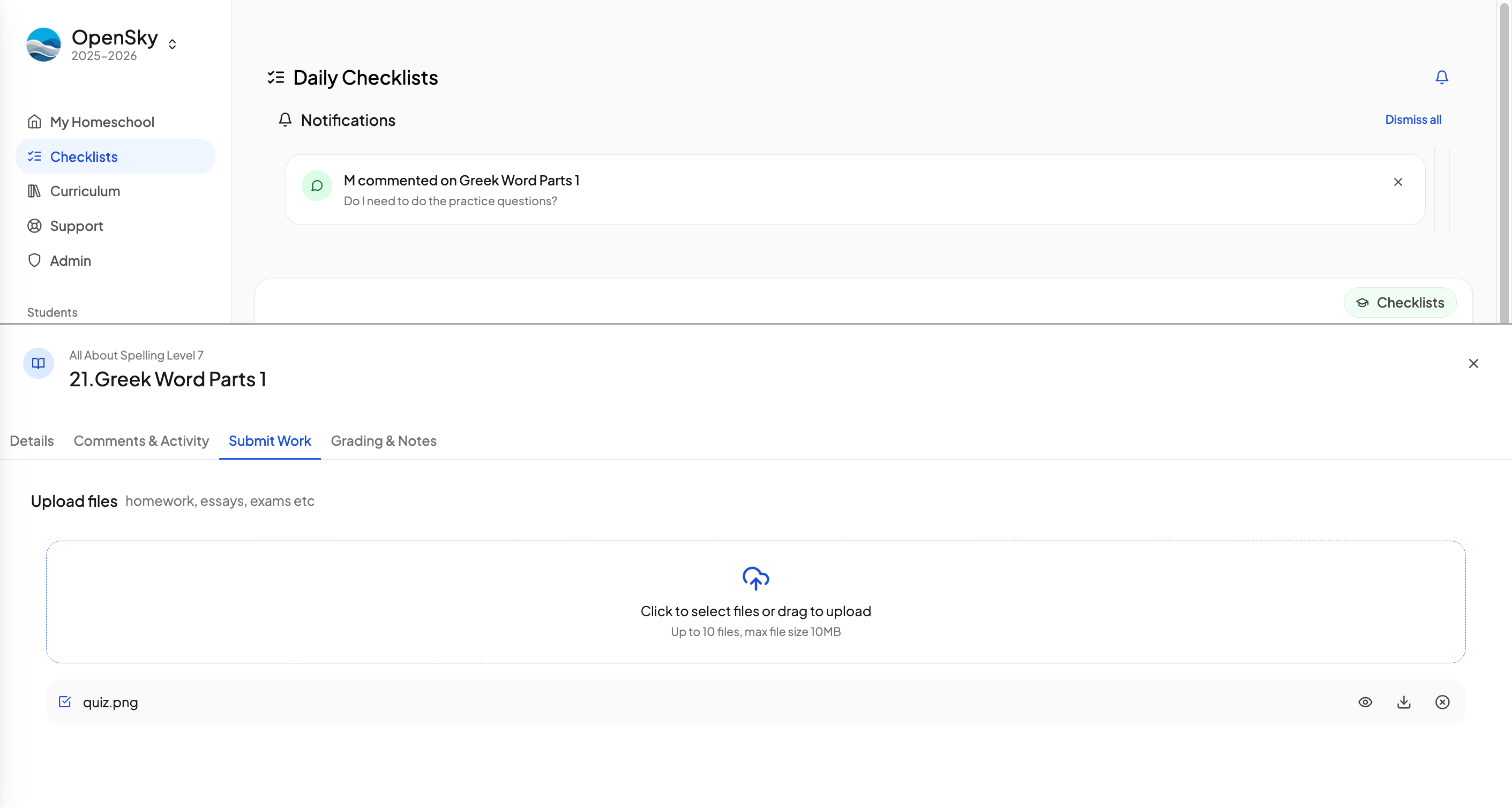 Everything stays organizedEach submission is automatically linked to its specific lesson. Parents can review all work in one organized place, making it easy to track progress and provide feedback.